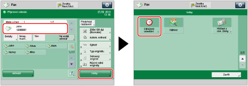 Uděláte-li při zadávání času odeslání chybu, stisknutím smažte zadání → zadejte jiné čtyřmístné číslo.Odloženou odesílanou úlohu lze zrušit pouze z obrazovky Monitor stavu / Zrušit. (Viz část "Zrušení úlohy.") |