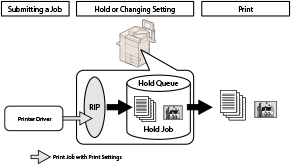 A submitted job is stored in the Hold Queue. Jobs in the Hold Queue have already completed the RIP (Raster Image Processor) process. You can output any job that is stored in the Hold Queue.