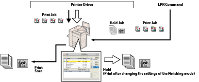 This function enables you to temporarily store the data of print jobs in a queue in the Hold Inbox (Hold Queue) specialized for the Job Hold function.