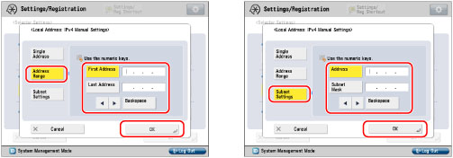 To specify a range of IPv4 addresses: Press [Address Range] → press [First Address] → enter the first IPv4 address → press [Last Address] → specify the last IPv4 address.