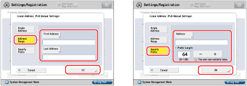 To specify the IPv6 address prefix: Press [Specify Prefix]. Press [Address] → enter the IPv6 address prefix → press [OK]. Enter the prefix length for the IPv6 address in [Prefix Length].