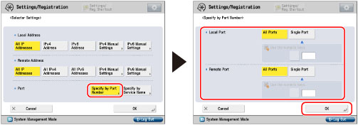 Press [Specify by Port Number] for <Port> → specify <Local Port> and <Remote Port> → press [OK].