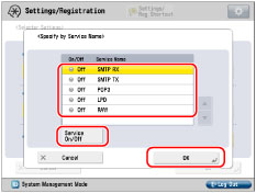 Select a displayed service name → press [Service On/Off] → press [OK].