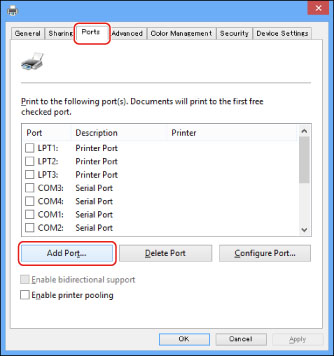 In the [Printer Ports] dialog box, select [Standard TCP/IP Port] from [Available ports types]/[Available port types] → click [New Port].