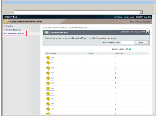 You can also select the desired inbox by entering its number next to <Box Number (00-49)> → click [Open...].