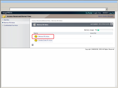 Click [Access Received/Stored Files] → [Memory RX Inbox] → [Memory RX Inbox].