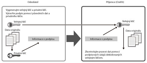 Schéma použití digitálního podpisu uvádíme níže. Metodou porovnání šifrovaných dat od odesílatele s veřejným klíčem může příjemce ověřit legitimitu odesílatele dat.