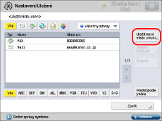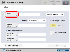 <Přijmout barevně> | Zadejte, zda místo určení podporuje příjem v barvách nebo ne. Jestliže místo určení podporuje příjem v barvách, stiskněte [Zap] → [Další] → nastavte velikost papíru a rozlišení. Jestliže místo určení nepodporuje příjem v barvách, stiskněte [Vyp] → nastavte velikost papíru, metodu komprese a rozlišení. |