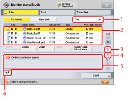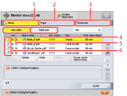 2 | Seznam úloh Na obrazovce stavu úloh můžete zobrazit aktuálně zpracovávané úlohy a čekající úlohy. Stisknutím tlačítek pod seznamem úloh můžete měnit pořadí čekajících úloh, rušit úlohy a kontrolovat detaily úloh. Zobrazená tlačítka se mohou lišit podle typu dané úlohy. Další informace o tlačítkách, které se zobrazují na obrazovce stavu úloh, viz v části "Ikony na obrazovce Úloha." |