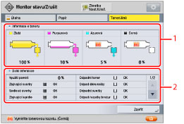 se otevře obrazovka Monitor stavu / Zrušit. Na této obrazovce můžete měnit pořadí úloh, rušit úlohy a kontrolovat podrobné informace v kategorii stav úloh a výpis úloh. Můžete zde také kontrolovat podrobné informace o stavu spotřebního materiálu.