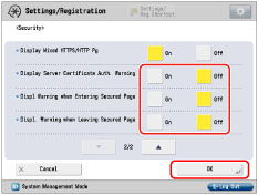 Press [Security] → select [On] or [Off] for the warning message you want to change setting → press [OK].