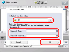 PDF files that are not allowed to be printed due to Adobe Acrobat settings, cannot be stored in a Mail Box. If there is no document password set for the selected PDF file, it is not necessary to enter the document password. After saving a PDF file with a password in a Mail Box, the file becomes a document without a password. To send it as a PDF file with a password, you must reset the password. If a PIN is set for the selected Mail Box, the screen for entering the PIN for the Mail Box appears. To confirm whether the file was stored, check the contents of the Mail Box that was selected as the storing destination. If you want to enter the Document Password, enter the correct password. If the password is entered incorrectly, the file will not be stored in the Mail Box. The mail box number, document number, and document password set when saving a PDF file to a Mail Box are cleared when you open a new PDF file. However, if you press [Refresh] to refresh the currently displayed page, these settings are not cleared. |