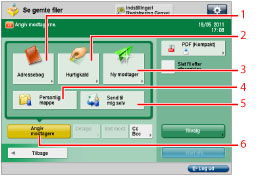 5 | [Send til mig selv] Anvendes til at angive din egen e-mailadresse som modtager. Administratoren kan begrænse modtagerens e-mail-adresse til brugerens adresse. (Se "Sådan angives Begrænset modtager for afsendelse af e-mail.") |