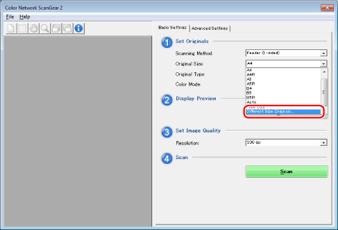 If a non-standard size original is included, you cannot use [Different Size Originals]. When scanning a non-standard size original, select [Free Size] from [Original Size]. You can only simultaneously scan originals whose width or length are the same. The window displayed may vary according to the operating system etc. |