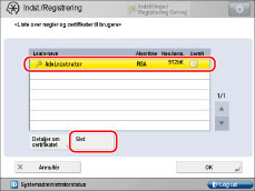 Hvis [Verficér cert.] er nedtonet eller <Nøglen er ødelagt eller ugyldig.> vises, kan du ikke anvende nøgleparret. Når du har slettet nøgleparret, skal du fra en computer installere et nøglepar og brugercertifikat på maskinen.