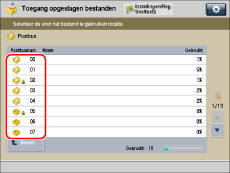 De geselecteerde bestanden zijn in de aangegeven volgorde genummerd en worden in die volgorde afgedrukt. U kunt een selectie annuleren door het betreffende bestand nogmaals te selecteren. Om alle bestandsselecties te annuleren, drukt u op [Wis selectie]. ([Wis selectie] verandert in [Alles selecteren (Max. 100 best.)].) Wanneer er twee of meer bestanden in een postbus zijn opgeslagen, kunt u op [Naam] of [Datum/Tijd] drukken om de lijst met bestanden te sorteren. Wanneer u de postbus sluit nadat de bestanden zijn gesorteerd, worden de bestanden ongesorteerd getoond wanneer u de volgende keer de postbus opent. Als een bestand vanaf een computer in de postbus is opgeslagen of als u een bestand uit een postbus verwijdert nadat de bestanden zijn gesorteerd, zal de bijgewerkte lijst gesorteerd blijven. Als u bij een geselecteerd bestand op [Naam], of [Datum/Tijd] drukt, wordt dat bestand gedeselecteerd en wordt het bovenste deel van de lijst met bestanden getoond. |