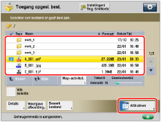 U kunt een selectie annuleren door het betreffende document nogmaals te selecteren. Wanneer er twee of meer bestanden op de geheugenmedia zijn opgeslagen, kunt u op [Naam] of [Datum/Tijd] drukken om de lijst met bestanden te sorteren. Wanneer u het scherm voor het selecteren van bestanden sluit nadat de bestanden zijn gesorteerd, worden de bestanden ongesorteerd getoond wanneer u het scherm voor het selecteren van bestanden opent. Als u bij een geselecteerd bestand op [Naam], of [Datum/Tijd] drukt, wordt dat bestand gedeselecteerd en wordt het bovenste deel van de lijst met bestanden getoond. |