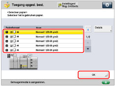 Voor meer informatie over papiertypen raadpleegt u "Afdrukmaterialen." Als u op [Details] drukt, wordt gedetailleerde informatie over het geselecteerde papier weergegeven. Druk op om over te schakelen naar de visuele weergave van de machine. Zie "Wijzigen van de standaardweergave van het scherm Selecteer papier ." voor meer informatie |