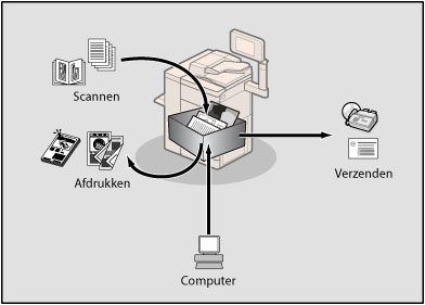 De postbus stelt gebruikers in staat met deze machine gescande bestanden op te slaan of gegevens afkomstig van een personal computer te verzenden via het printerstuurprogramma. U kunt het opgeslagen document met de gewenste instellingen indien gewenst afdrukken. U kunt de bestandsindeling van documenten converteren naar een andere indeling, zoals PDF, om met de verzendfunctie via e-mail of fax te verzenden.