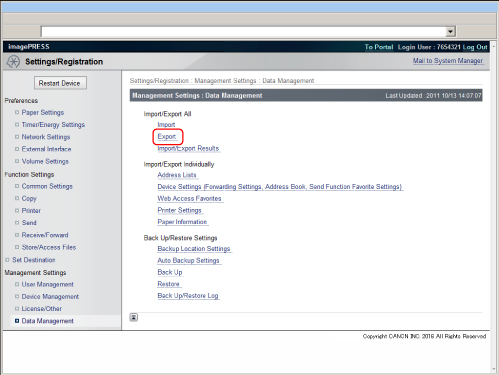 If you import the Department ID Management Settings when using the Import All function, system manager information settings such as an ID or password are overwritten. Check the system manager information of the machine for exporting before using the Export All function, as it is required when logging in to the destination machine for importing. The Export All function is not available in the following situations: Executing/waiting any jobs (sending, forwarding, receiving i-fax, printing reports, functions specified by the Delayed Send mode) During an Import/Export Individually operation Viewing the address book using the Remote UI from another imagePRESS series Delivering the device information While error is occurring Backing up inbox data |