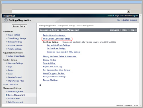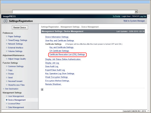 Click [Settings/Registration] → [Device Management] for <Management Settings>.