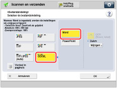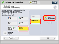 → [Scannen en verzenden] → geef de bestemming op → druk op de knop om de bestandsindeling te selecteren.