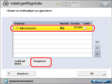 Als [Certif. contr.] niet beschikbaar is of <De sleutel is onjuist of ongeldig.> wordt weergegeven, kunt u het sleutelpaar niet gebruiken. Na het wissen van het sleutelpaar, installeert u een sleutelpaar en gebruikerscertificaat in de machine vanaf een computer.