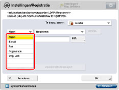 De organisatie/organisatie-eenheid kan alleen als zoekcategorie worden gebruikt als de informatie was opgeslagen op de LDAP-server. De Organisatie/Org. eenh. is wellicht niet mogelijk. Dit hangt af van de attribuuttypen die op de LDAP-server zijn opgeslagen en het type toepassing op de server. |