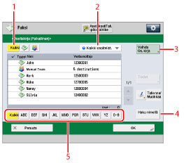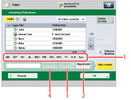 5 | Hae alkukirjaimella -painike Paina aakkosnumeerisia painikkeita (esim. [ABC]) saadaksesi näyttöön erilliset kirjain- tai numeropainikkeet. Voit valita joko kirjaimen tai numeron rajoittaaksesi näytössä olevat syöttömahdollisuudet. Paina [Kki] palataksesi koko osoitelistaan. |