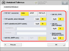 Vaikka valitset [Kyllä] kohtaan <Salli TLS (SMTP-lähetys)>, dataa ei salata jos SMTP-isäntä ei tue salausta. Vaikka valitset [Kyllä] kohtaan <Salli TLS (POP)>, dataa ei salata jos POP-palvelin ei tue salausta. |