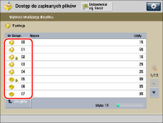 Zaznaczone pliki są numerowane zgodnie z kolejnością ich zaznaczania i drukowane są w tej kolejności. Możliwe jest usunięcie zaznaczenia poprzez ponowne zaznaczenie pliku. Aby anulować wybór wszystkich plików, naciśnij na [Wyczyść wybór].([Wyczyść wybór] zmieni się na [Zaznacz wszystko (Maks. 100 dok.)].) Gdy w Skrzynce pocztowej zapisanych jest 2 lub więcej plików, naciśnij na [Nazwa] lub [Data/Czas], aby posortować listę plików. Jeżeli użytkownik wykona sortowanie plików i zamknie Skrzynkę pocztową, po jej ponownym otwarciu pliki nie będą posortowane. Jeśli plik został zapisany w Skrzynce pocztowej z użyciem komputera, lub jeśli po wykonanym sortowaniu plików jeden z plików został skasowany, zaktualizowana lista pozostanie posortowana. Jeżeli naciśniesz na [Nazwa] lub [Data/Czas] pliku tego nie traktuje się jako wybrany i wyświetlana jest górna część listy pliku. |
