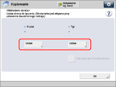 <Tylna strona> może być wybrana jedynie w przypadku dwustronnych oryginałów. Aby określić te same ustawienia jak w przypadku <Przednia Strona> dla <Tylna strona>, naciśnij na [Tak samo jak przednia strona]. |