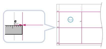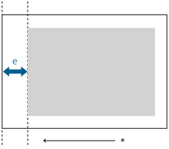 Zmierzyć długość 'e', czyli odległość od głównej krawędzi zadrukowanego obszaru do głównej krawędzi papieru i wprowadzić różnicę (wartość domyślna to 20mm).