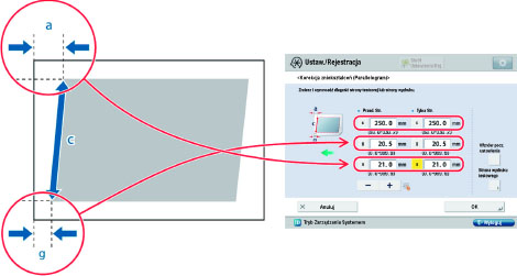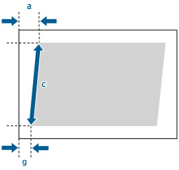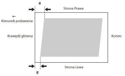 Ustawienie umożliwia korekcję kształtu obrazu poprzez dopasowanie długości od 'a' i 'g' do krawędzi głównej papieru, gdy obraz jest drukowany w postaci równoległoboku.