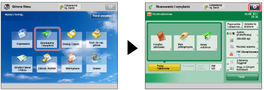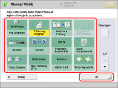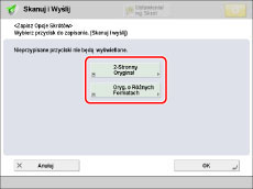 Dwa skróty opcji są wyświetlane na ekranie Skanowanie i drukowanie.[Dwustronny oryginał] oraz [Oryginały o róż. formacie] są wyświetlane jako domyślne.Te skróty mogą być zmienione do postaci często używanych funkcji.
