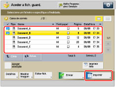 Os ficheiros selecionados são numerados pela ordem especificada e impressos pela mesma ordem. Pode cancelar uma seleção se voltar a especificar o ficheiro. Para cancelar todas as seleções de ficheiros, carregue em [Apagar seleção]. ([Apagar seleção] muda para [Selecionar tudo (máx. 100 fich.)].) Se existirem dois ou mais ficheiros guardados na caixa de correio, pode carregar em [Nome] ou [Data/Hora] para ordenar a lista de ficheiros. Se fechar a caixa de correio depois de ordenar os ficheiros, estes voltam a ficar desordenados da próxima vez que abrir a caixa de correio. Se guardar um ficheiro na caixa de correio a partir de um computador ou se, depois de ordenar os ficheiros, apagar um deles da caixa de correio, a lista atualizada permanece ordenada. Se carregar em [Nome] ou [Data/Hora] com um ficheiro selecionado, anula a seleção desse ficheiro e aparece o topo da lista de ficheiros. |
