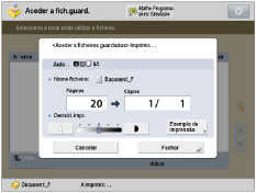 Para cancelar a impressão, carregue em [Cancelar]. Não pode cancelar a impressão carregando em .Para reservar o próximo trabalho de impressão, carregue em [Fechar] → execute o procedimento para reservar um trabalho de impressão. (Consulte " Reservar trabalhos.") |