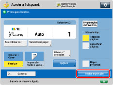 Para cancelar a impressão, carregue em [Cancelar]. (Não pode cancelar a impressão carregando em .)Para reservar o próximo trabalho de impressão, carregue em [Fechar] → siga o procedimento para reservar um trabalho de impressão. (Consulte " Reservar trabalhos.") |