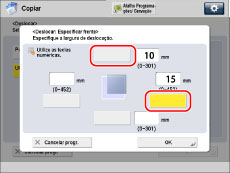 Se selecionar [Por posição], se o original e o papel de cópia tiverem o mesmo formato e se o rácio de cópia estiver programado para 100%, a imagem do original não é deslocada. Se selecionar [Utilizar teclas num.], a imagem do original pode ficar parcialmente cortada na cópia. A quantidade cortada depende dos formatos do original e do papel de cópia, bem como do valor especificado para a deslocação. |
