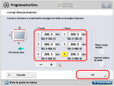 [b]: | Introduza o comprimento medido da marca "b" na página de teste (para a folha longa: o comprimento medido da marca "b" mais próxima da extremidade inferior do papel). |