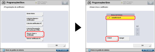Carregue em [Gravar chave e certificado] → selecione o ficheiro que pretende gravar → carregue em [Gravar].