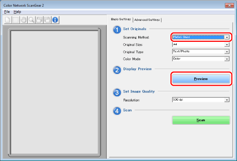 Select [Platen Glass] for [Scanning Method] → click [Preview].