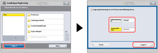 [Systemansvarigs-ID]: | Tryck på [Systemansvarigs-ID] → ange numeriska tecken (upp till sju siffror) med - (siffertangenterna). Du måste ställa in systemansvarigs ID för att kunna administrera användningen av maskinen. |