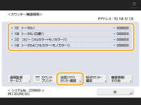 <遠隔監視サービス> <通信テスト>を押して、遠隔監視サーバーへ通信確認を行います。この項目を実行すると、本機の情報が定期的に遠隔監視サーバーへ送信されるようになります。ご利用にはサービスを提供するサーバーと本機が通信できるようにする必要があります。コピー、プリント、スキャン、ファクスしたページ数をレポートとしてプリントすることができます。 カウントしたページ数をMEAPアプリケーションごとに確認することもできます。手順2の画面で<MEAPカウンター確認>を押します。また、同じ画面で<機器情報/その他> <デバイス構成確認>を押すと、本機に装着されているオプションや、HDDデータ暗号化に関わるセキュリティーチップのバージョンを確認することができます。カウント条件については、販売店または担当サービスにお問い合わせください。 |
