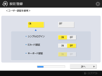 本機のセキュリティーを高めるために、ユーザー認証を使用する体制で運用してください。 ![]() ![]() <ユーザー認証を使用>の<ON>を押して使用するログイン方法の<ON>を押し、<次へ>を押します。 ユーザー認証を使用しない場合は、<ユーザー認証を使用>の<OFF>を押したあと<OK>を押し、Step 5へ進みます。 ![]() 本機に「Administrator」ユーザー以外に管理者が登録されていない場合は、次の設定を行います。 ![]() 本機のセキュリティーを高めるため、新規に管理者を登録して「Administrator」ユーザーを無効にする場合は、<はい>を押します。<管理者ユーザーの登録>で<ユーザー名>、<パスワード>を押してそれぞれ入力し、<OK>を押します。必要に応じて<Eメールアドレス>、<部門ID>、<表示名>を設定してください。詳しくは、ローカルデバイスにユーザー情報を登録するを参照してください。「Administrator」ユーザーは次回ログイン時から無効になります。 「Administrator」ユーザーで運用する場合は、<いいえ>を押します。 ![]() ![]() ログイン画面を表示するタイミングを選びます。<機能選択時に表示>を選んだ場合は、<ファンクション>を押して、ログイン画面を表示させる機能を選び、<OK>を押します。また、<設定/登録>画面でどの項目を設定するときにログイン画面を表示させるかを選びます。 <シンプルログイン>と<キーボード認証>を<OFF>にした場合は、<OK>を押します。Step 5へ進みます。 <シンプルログイン>または<キーボード認証>を<ON>にした場合は、<次へ>を押します。 ![]() ![]() ログイン画面でテンキー入力のみによる認証を使用する場合は、<ON>を押します。 <シンプルログイン>を<OFF>にした場合は、<OK>を押します。Step 5へ進みます。 <シンプルログイン>を<ON>にした場合は、<次へ>を押します。 ![]() ![]() シンプルログインで暗証番号の入力を強制したい場合は<ON>/強制しない場合は<OFF>を押し、<次へ>を押します。 ![]() ![]() プリント機能に適した状態でシンプルログインを使用したい場合は、<ON>を押します。強制留め置き印刷が有効になり、パソコンからの印刷データを利用してユーザー登録したり、プリントするユーザーに適したログイン画面をデフォルト表示にしたりする設定になります。詳しくは、強制留め置き印刷の設定をする、<ユーザーの登録方法>、<シンプルログイン画面のデフォルト表示の変更>を参照してください。 ![]() ![]() シンプルログイン画面のプリセットボタン数を選び、<OK>を押します。 本機はログインサービスにUser Authentication(個人認証管理)を使用する設定になっています。詳しくは、個人認証管理を開始するを参照してください。 | |