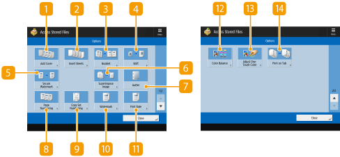 When you press <Access Stored Files> on the <Home> screen, and then press <Mail Box>, <Advanced Space>, <Network>, or <Memory Media> to print files, the following setting screen is displayed.