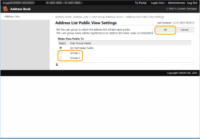 You can set to also change the name of the user group address book when a user group name is changed. Log in to the Remote UI as a user with Administrator privileges, press [Settings/Registration] [Set Destination] [Personal Address List/User Group Address List Settings], and select the [Apply User Group Name Change to User Group Address List Name] check box. [Apply User Group Name Change to User Group Address List Name] is only available when personal authentication management is enabled.