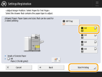 Clean the platen glass and the underside of the feeder before adjustment. Cleaning the Platen Glass/Cleaning the Feeder Use the following conditions to print the guide sheet. Accurate adjustment results may not be obtained if the guide sheet is not printed appropriately. Paper size: A3 or 11" x 17" Finish: Uncoated, 1-Sided Coated, or 2-Sided Coated Type: None (Normal) Basis Weight: Paper that two-sided printing can be performed on and is 80 g/m2 or heavier (paper that is 200 g/m2 or heavier is recommended) If an edge of the test page is cut incorrectly or folded, or the image is not correctly printed on the test page, the message <Correctly place the test page on the platen glass.> may appear during the scanning process. Adjustment may not be performed correctly with some types of paper, such as textured paper with rough surface or colored paper. If adjustment is not performed correctly when <Use Scanner> is selected, select <Do Not Use Scanner> instead. |