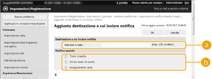 Fare clic su [Gestione periferiche] [Impostazioni notifica tramite e-mail]  [Aggiunta destinazione a cui inviare notifica...].