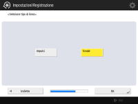 Specificare le impostazioni necessarie per utilizzare la funzione fax. ![]() Se il prodotto opzionale necessario per l'invio di fax (Opzioni di sistema) non è installato, passare alla Fase 10. Selezionare il paese/la regione se compare la schermata di selezione, quindi premere <Avanti>. ![]() ![]() Inserire il numero di fax e premere <Avanti>. Per ulteriori informazioni sulle impostazioni del fax, vedere Impostazioni della linea fax. ![]() ![]() Premere <Imposta>, inserire il nome utente e premere <Avanti>. ![]() ![]() Selezionare il tipo di linea e premere <OK>. | |